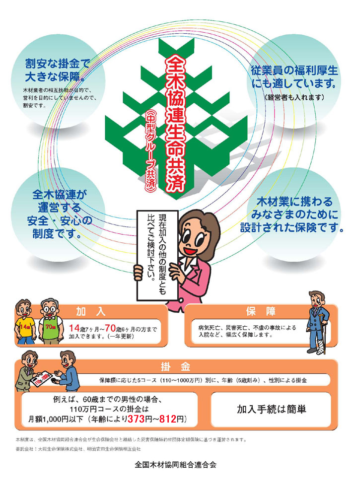 <個人情報のお取扱いについて> 当会は、この制度の運営において取得する個人情報(被保険者の氏名・性別・生年月日・健康状態等、事業主の氏名・住所・口座情報等および保険金受取人の氏名・続柄)をこの制度の事務手続き、各種サービスのご案内・提供のために利用し、委託保険会社および事務委託会社へ提供します。